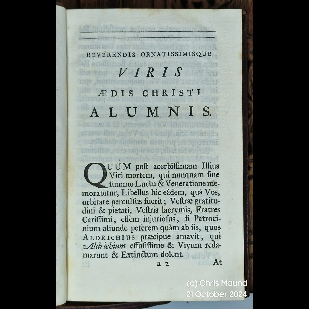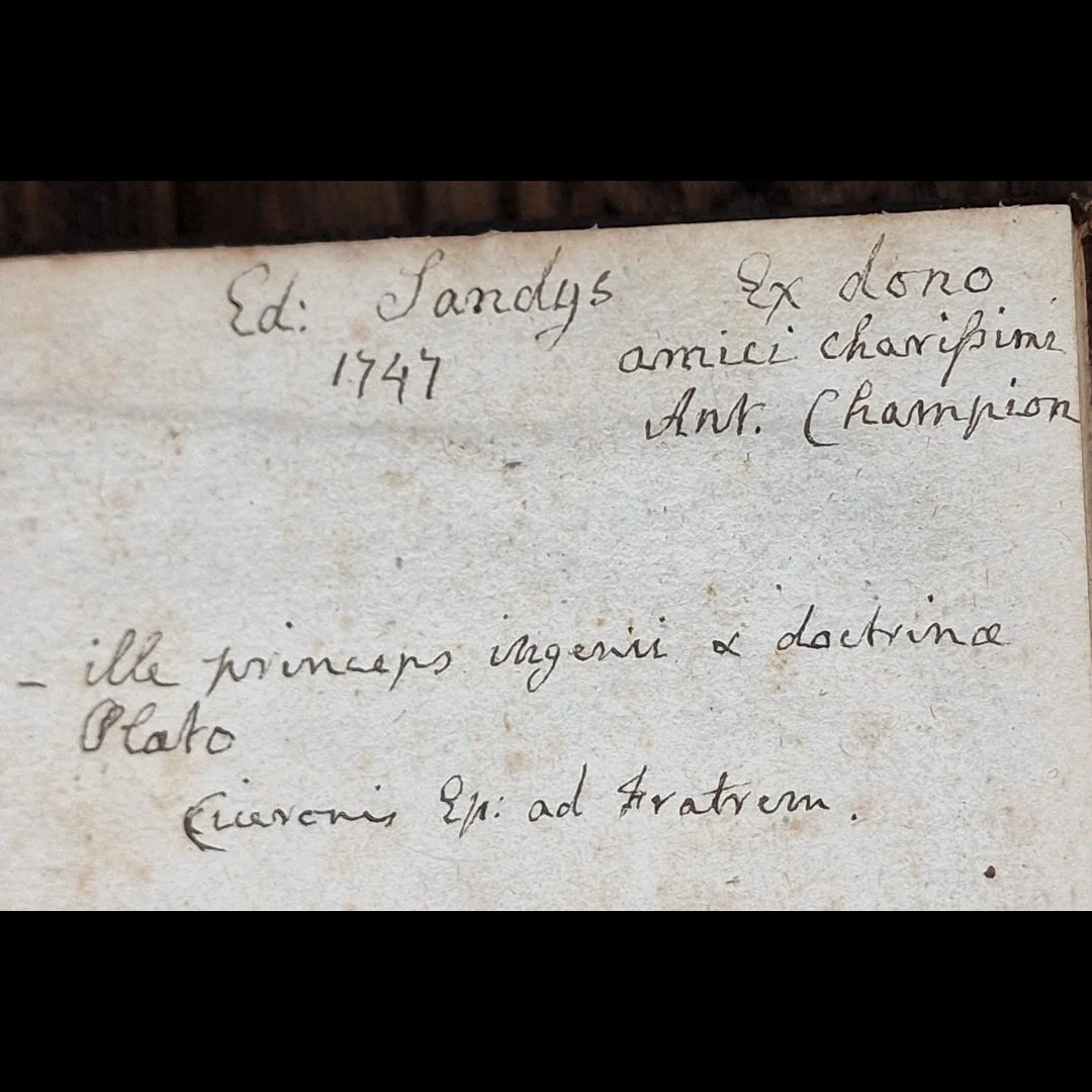 Very Good - Early 18th-century panelled calf, blind-tooled to a central panel with corner scrolls; raised bands. Edges sprinkled. Early ink inscription on front flyleaf: “Ed. Sandys 1747 — ex dono amici charissimi Ant. Champion.” Below, a Latin note citing Plato (“ille princeps ingenii & doctrinae Plato; Ciceronis Ep. ad Fratrem.”). Early pencil price mark on flyleaf. Light toning and occasional spotting; title with mild dusting; joints rubbed with small scuffs and corner wear; boards showing a few old marks. A pleasant, honest, unsophisticated copy; sound and complete with errata. Please see photos as part of condition report